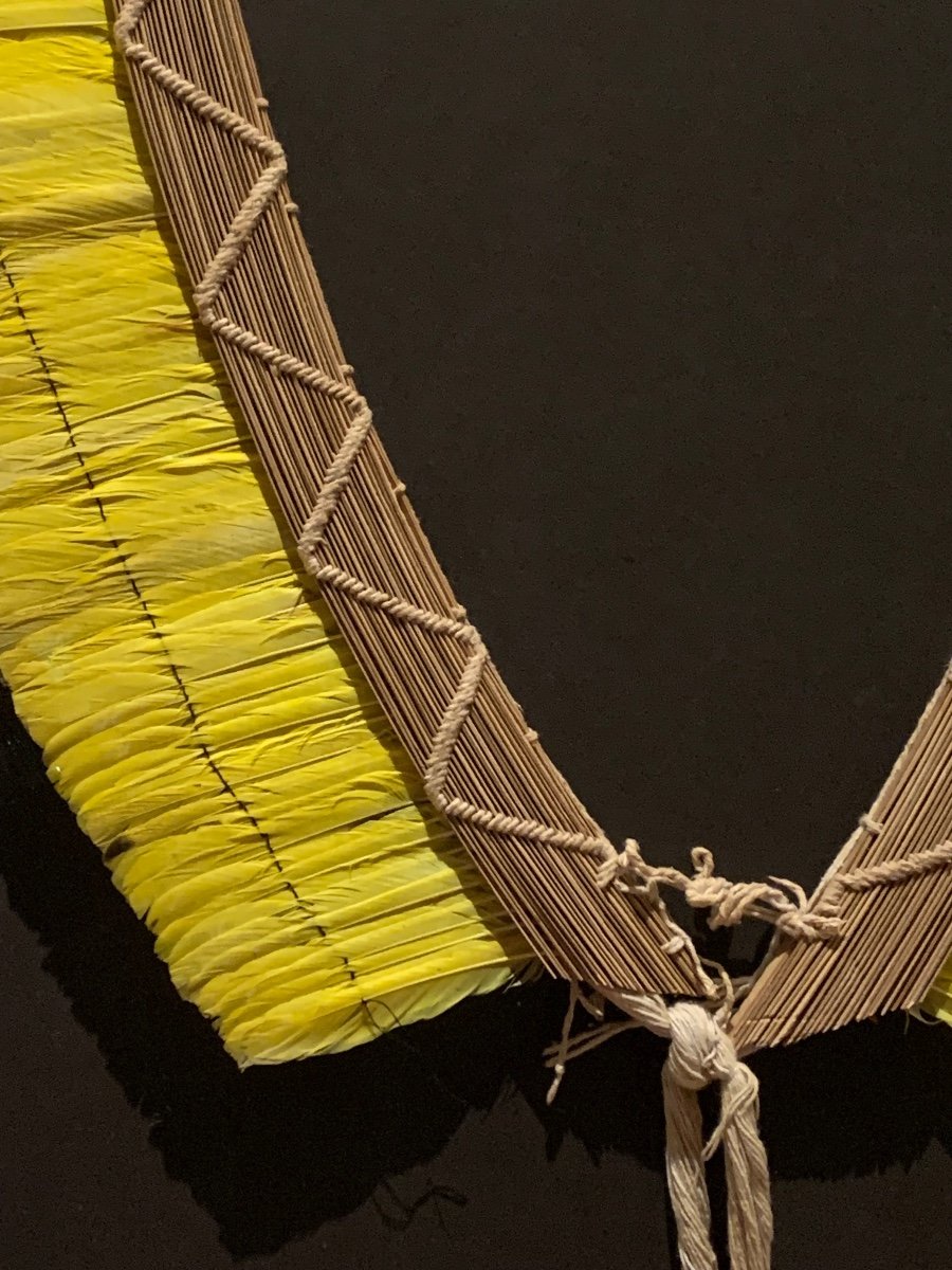 Grandes plumes jaune or d’ara aratinga sur deux arceaux de fibres de palmier et maintenues par des fils de coton .
