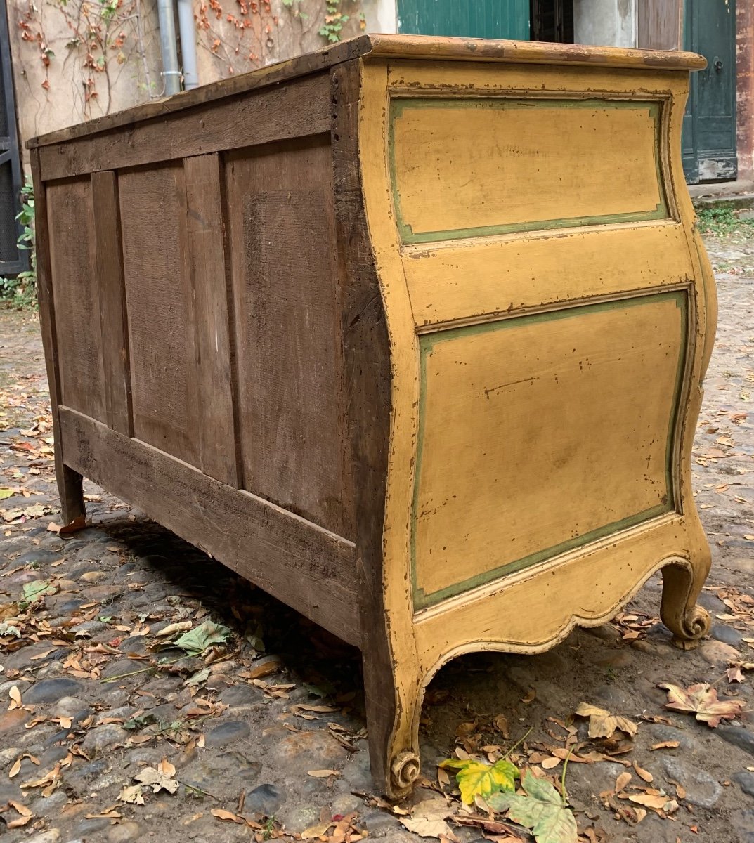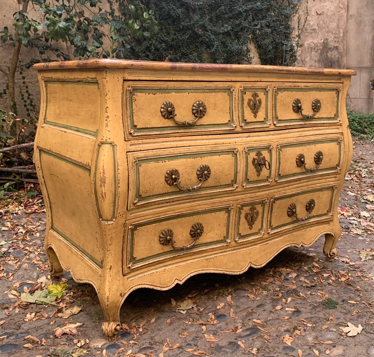 La structure en noyer , les façades laquées jaune rechampies en vert .