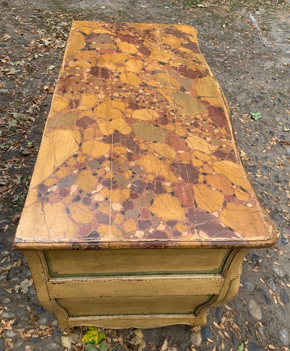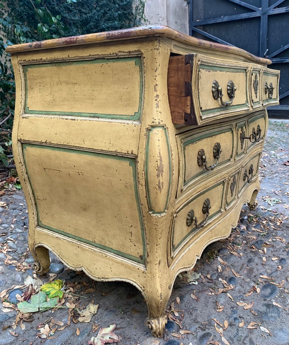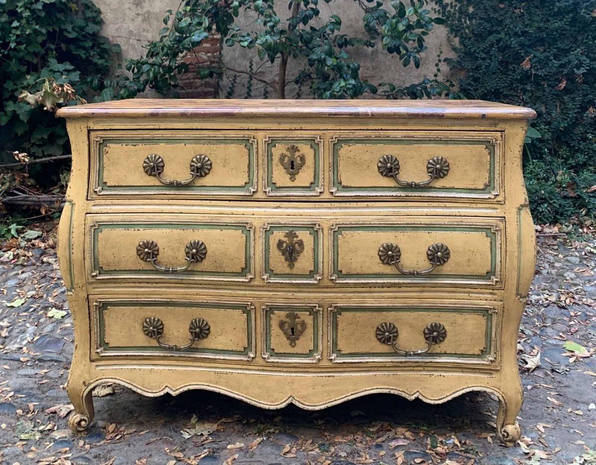 Belle commode galbée en bois peint à trois rangs de tiroirs .