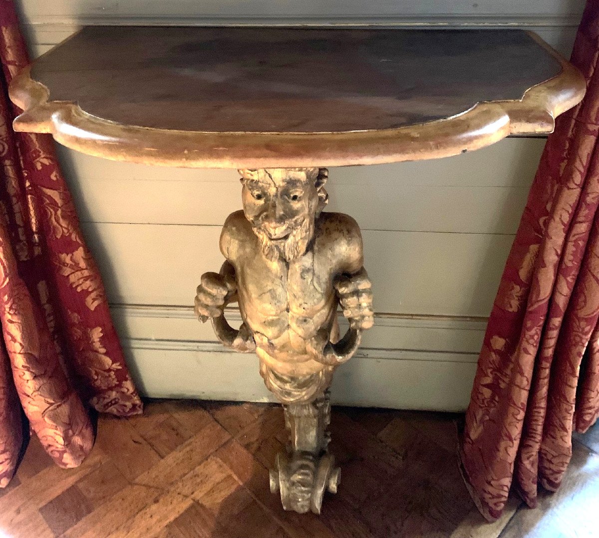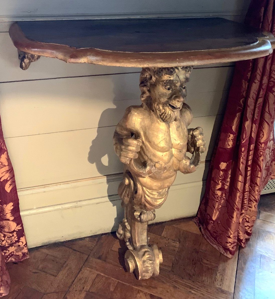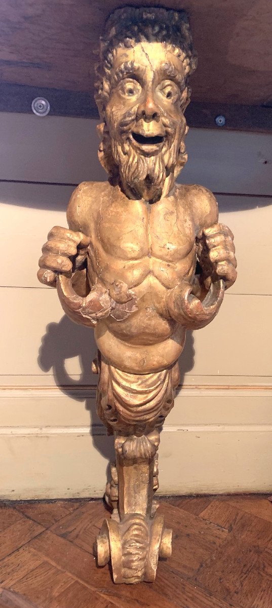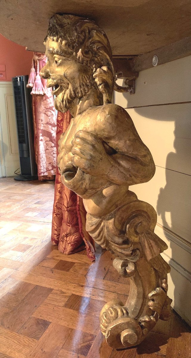 Piètement central représentant un faune en bois doré et sculpté.