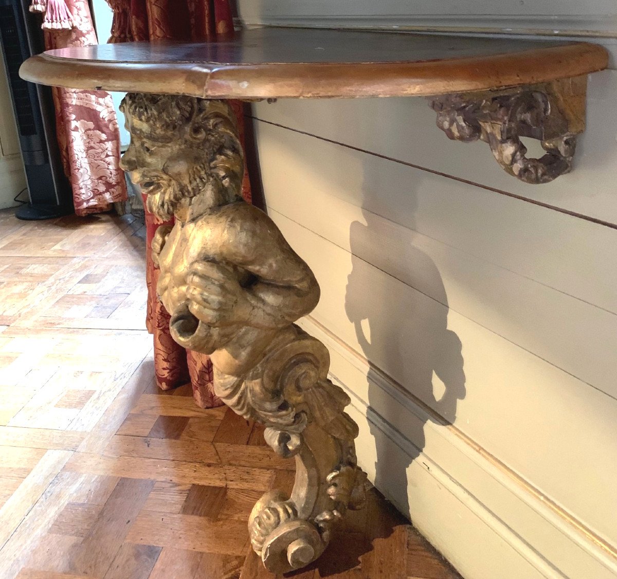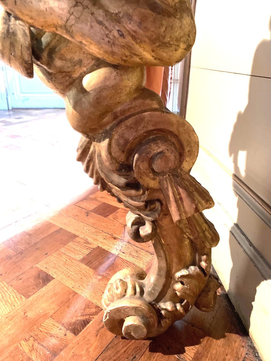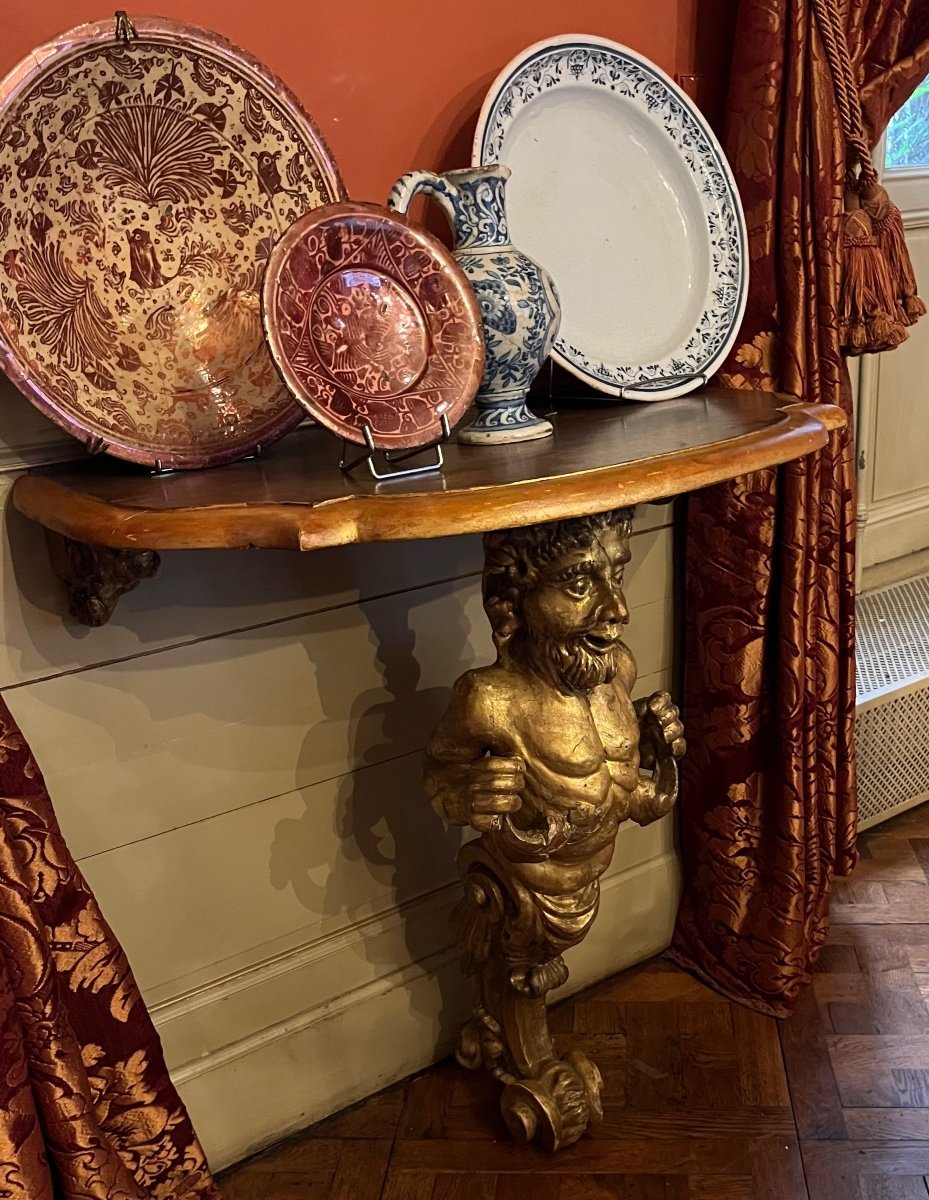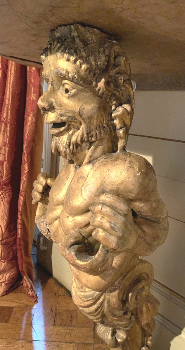Piètement central représentant un faune en bois doré et sculpté.