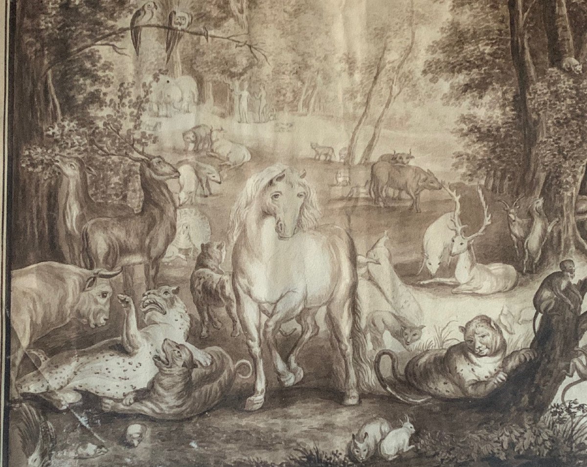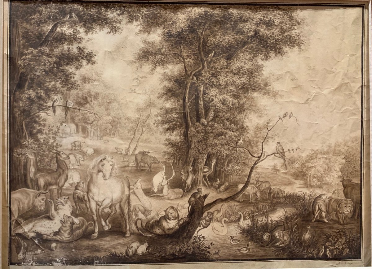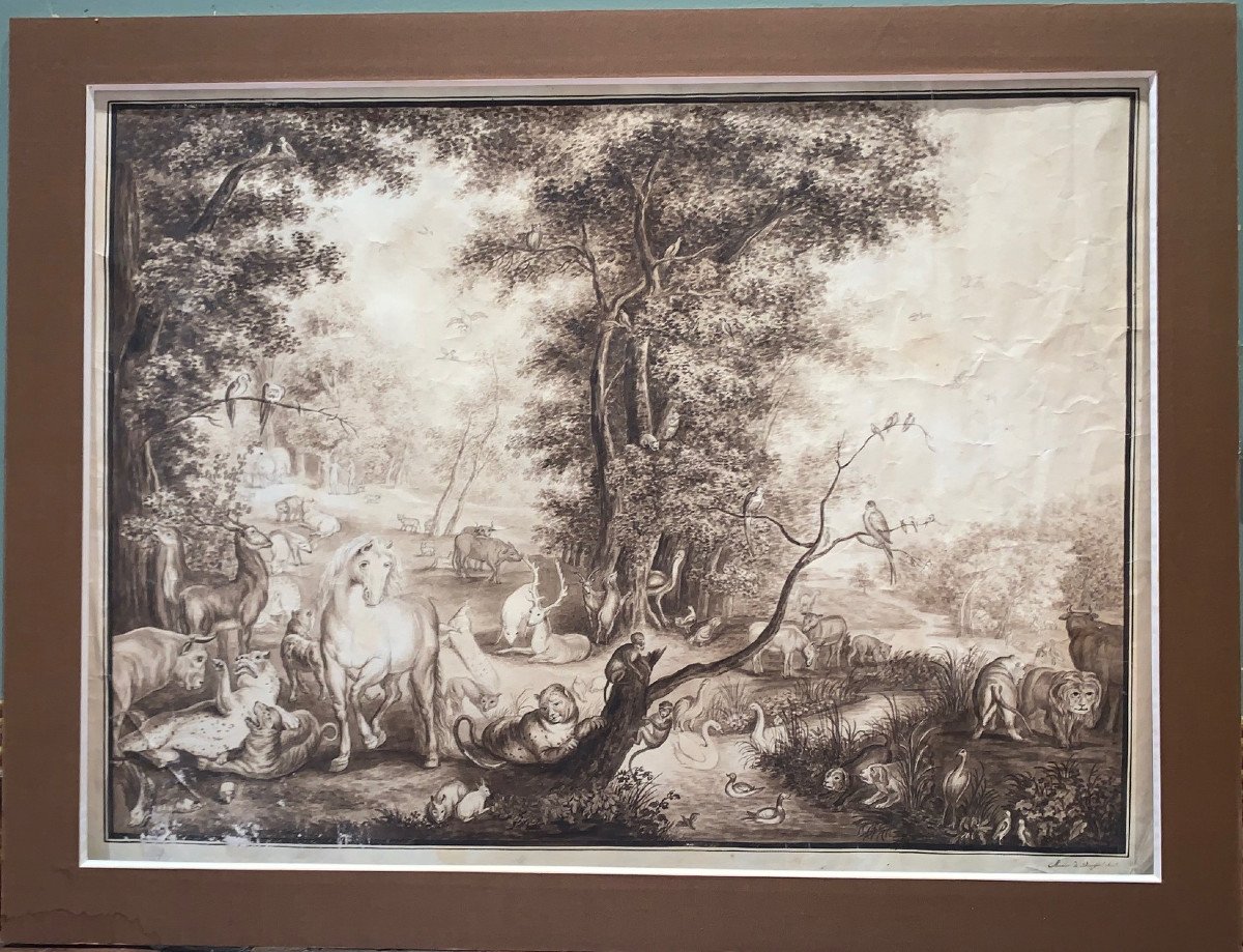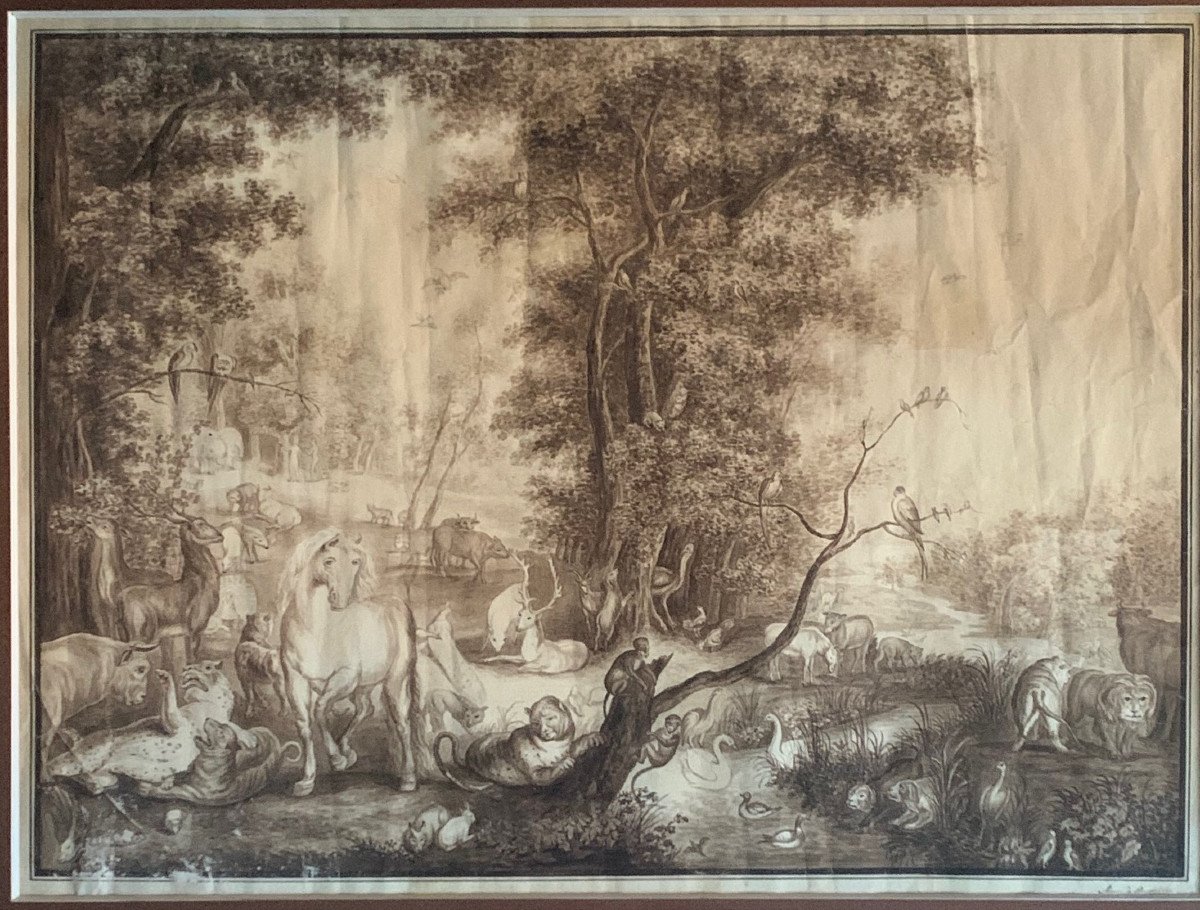 Grand dessin représentant « Le Jardin d’Eden »d’après un tableau de Jan Brughel l’Ancien ( 1568-1625 ).