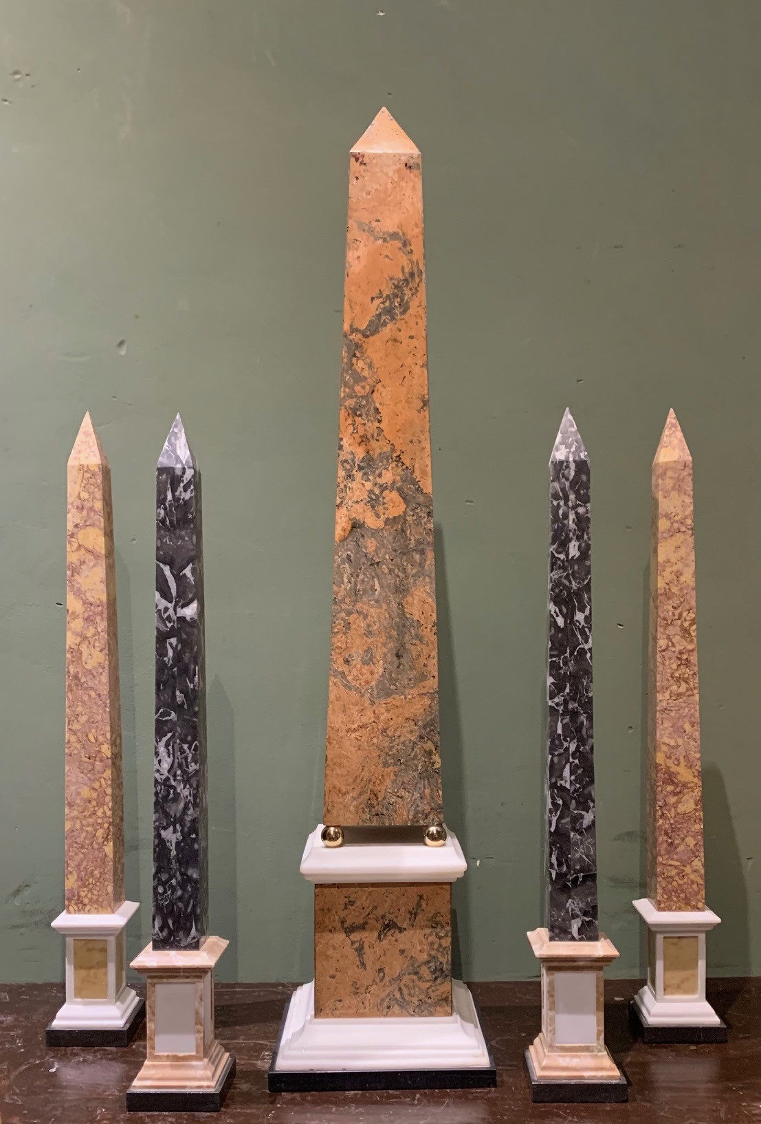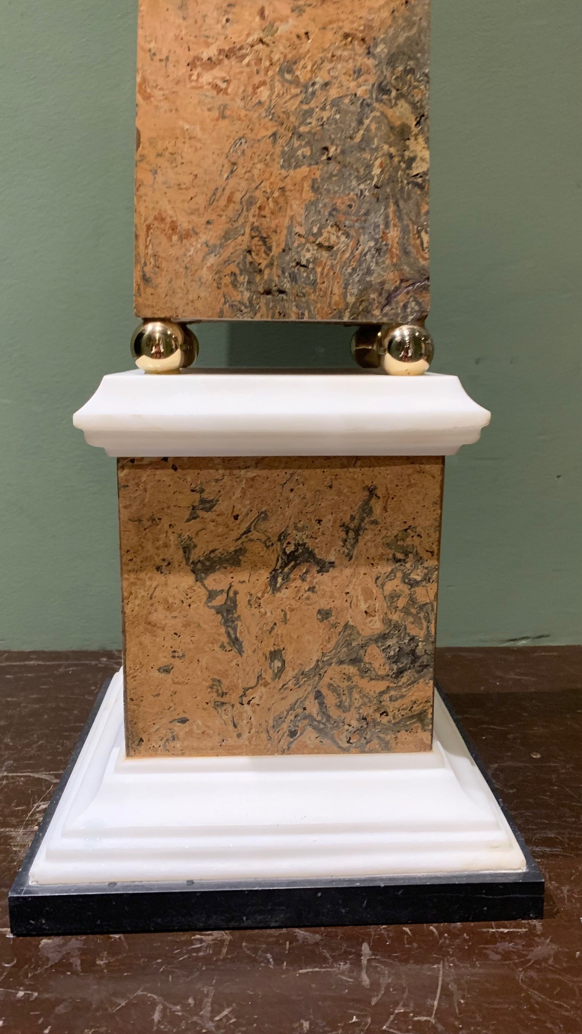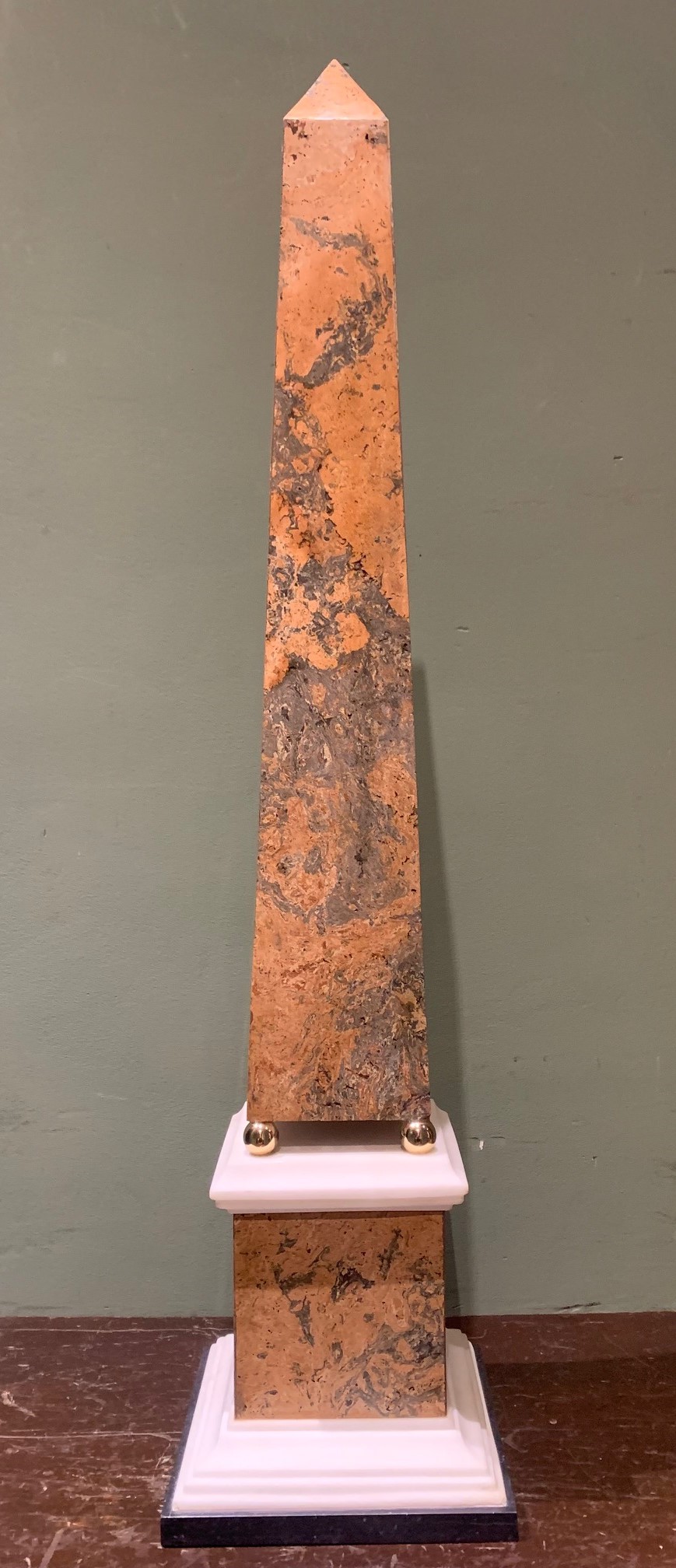 Très grand obélisque en marbre posé sur de petits socles boules en bronze doré :