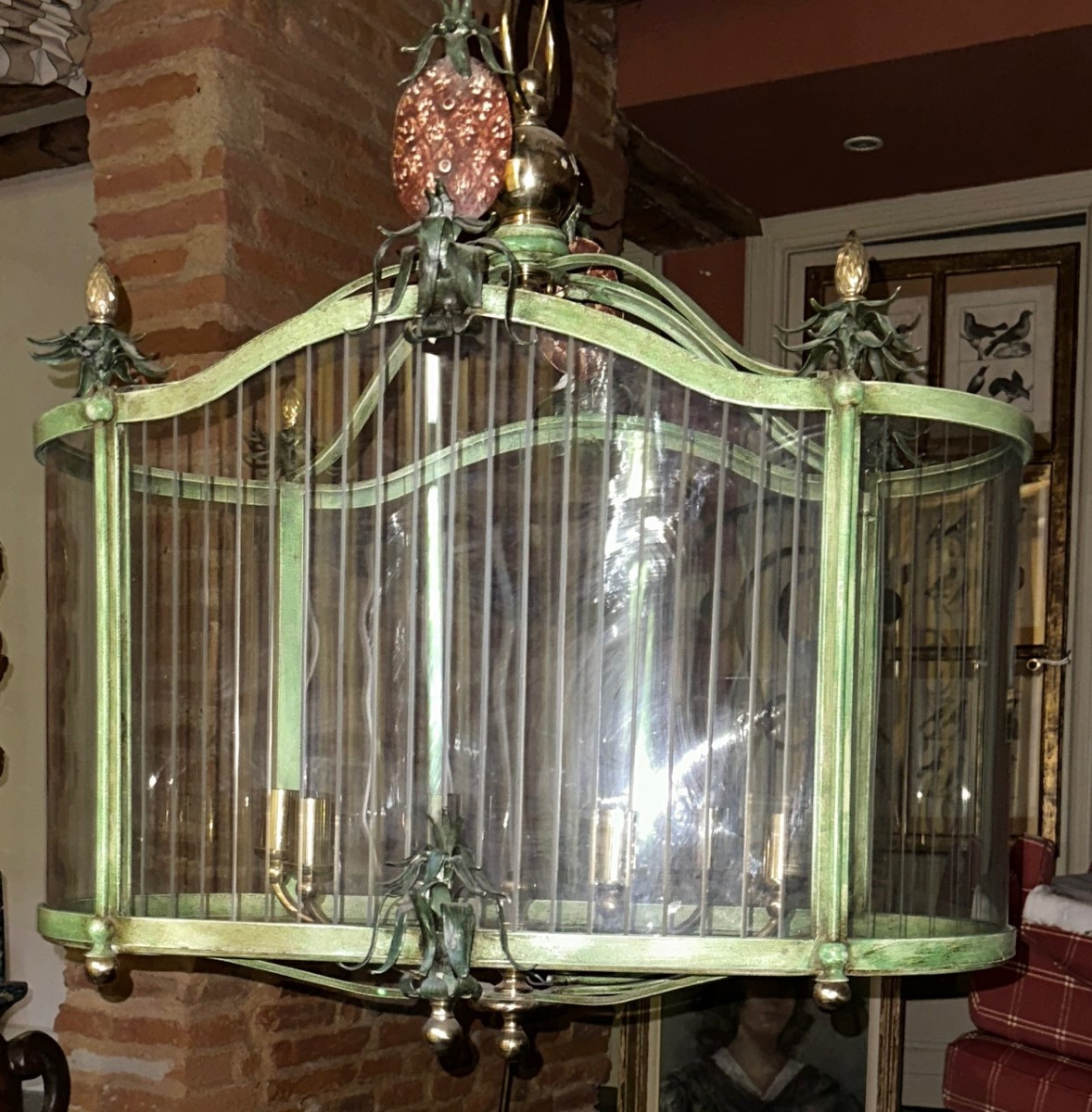 Grande lanterne en laiton fer forgé et verres galbés et gravés à 6 bras de lumière.
