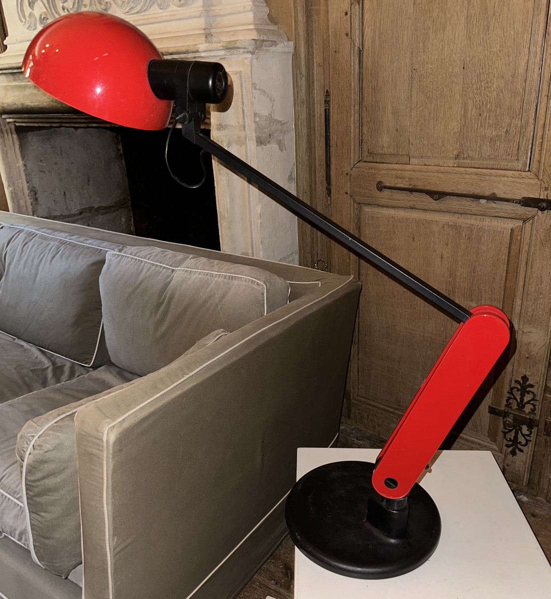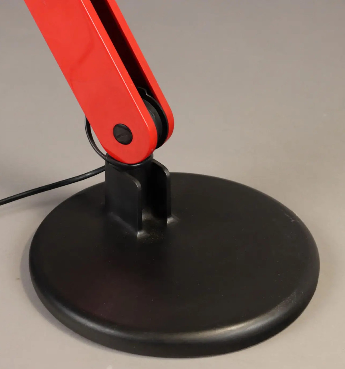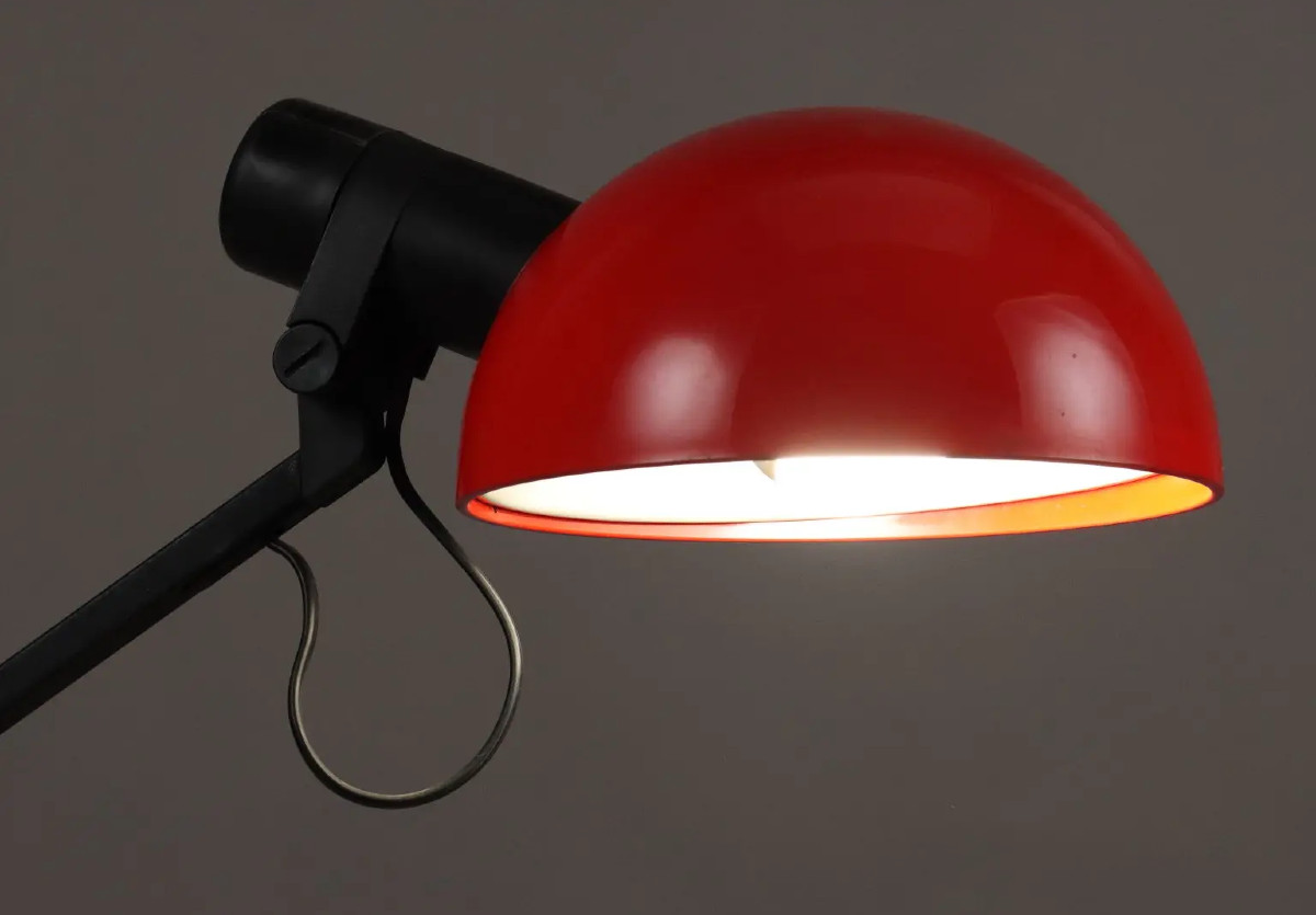Lampe de bureau articulée en métal rouge sur un socle en fonte noir.