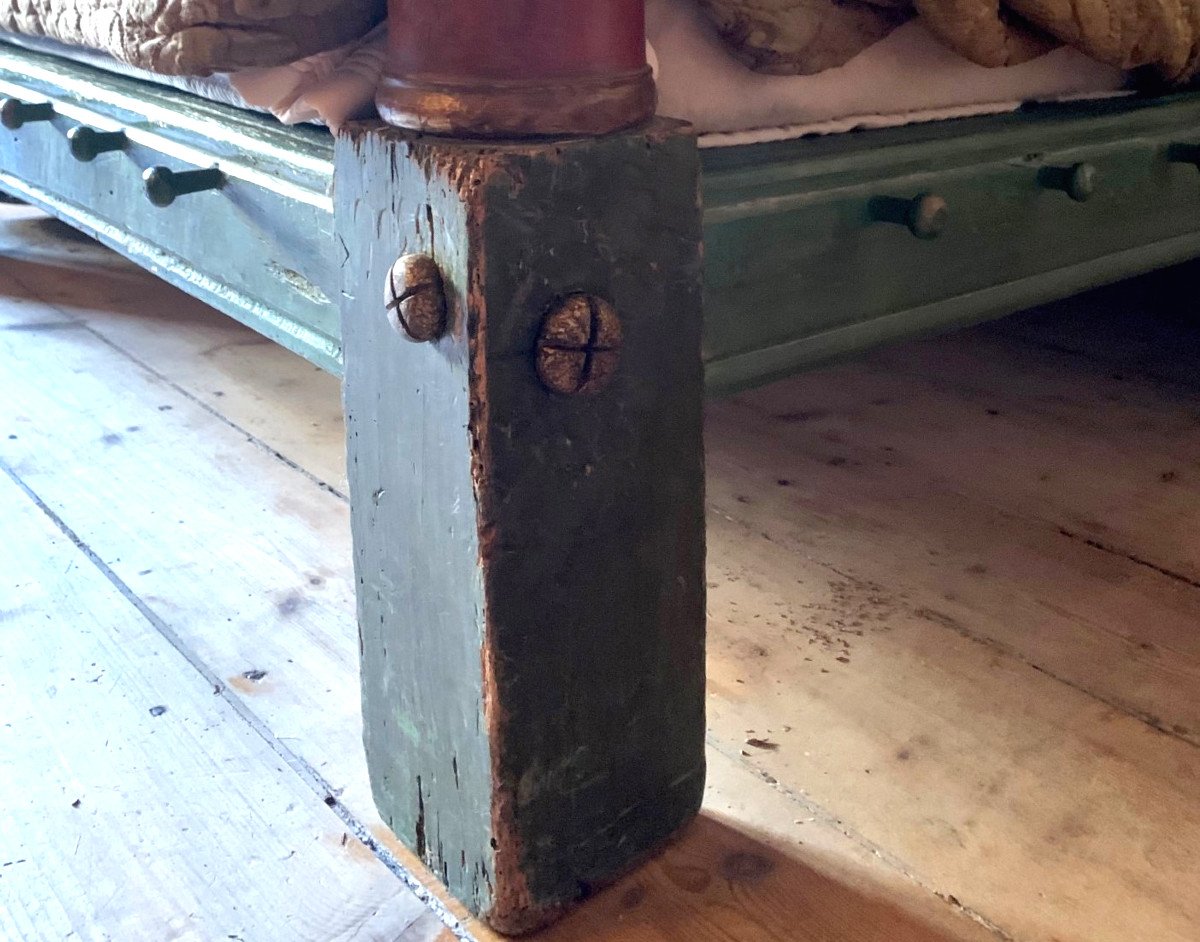 Longs pans à tirefonds d’époque ( on voit sur cet ensemble les fixations des lanières qui servaient en son temps de sommier ).