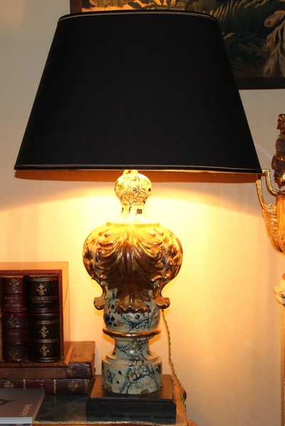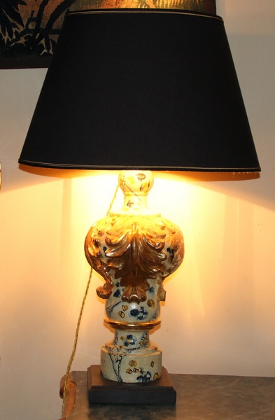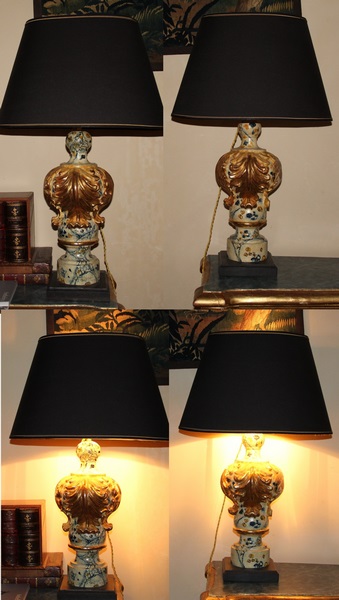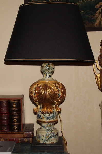 Paire d’éléments 17° en bois doré et polychrome montés en lampes : la base carrée récente