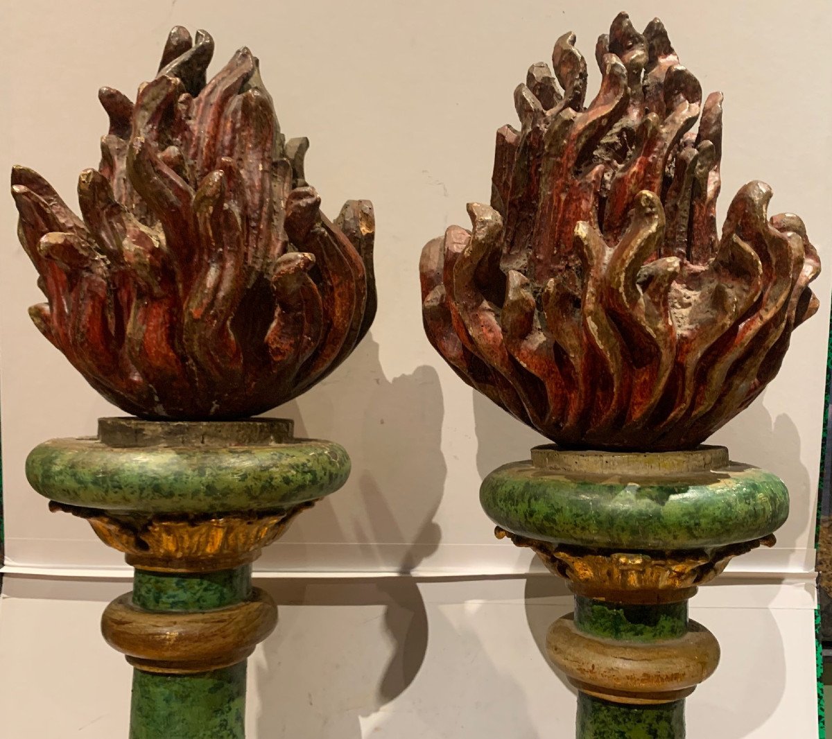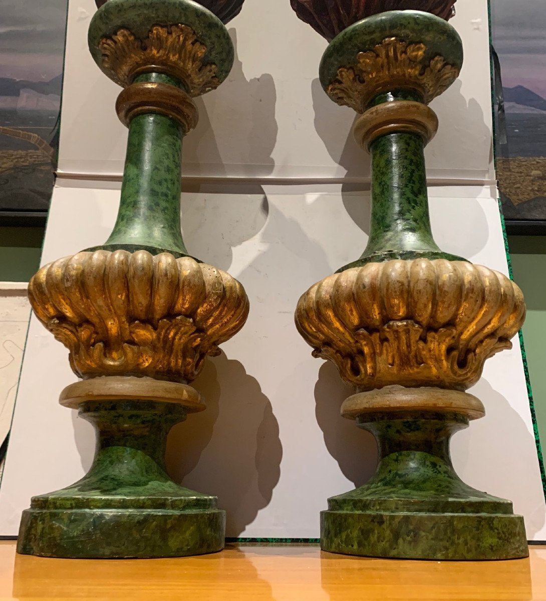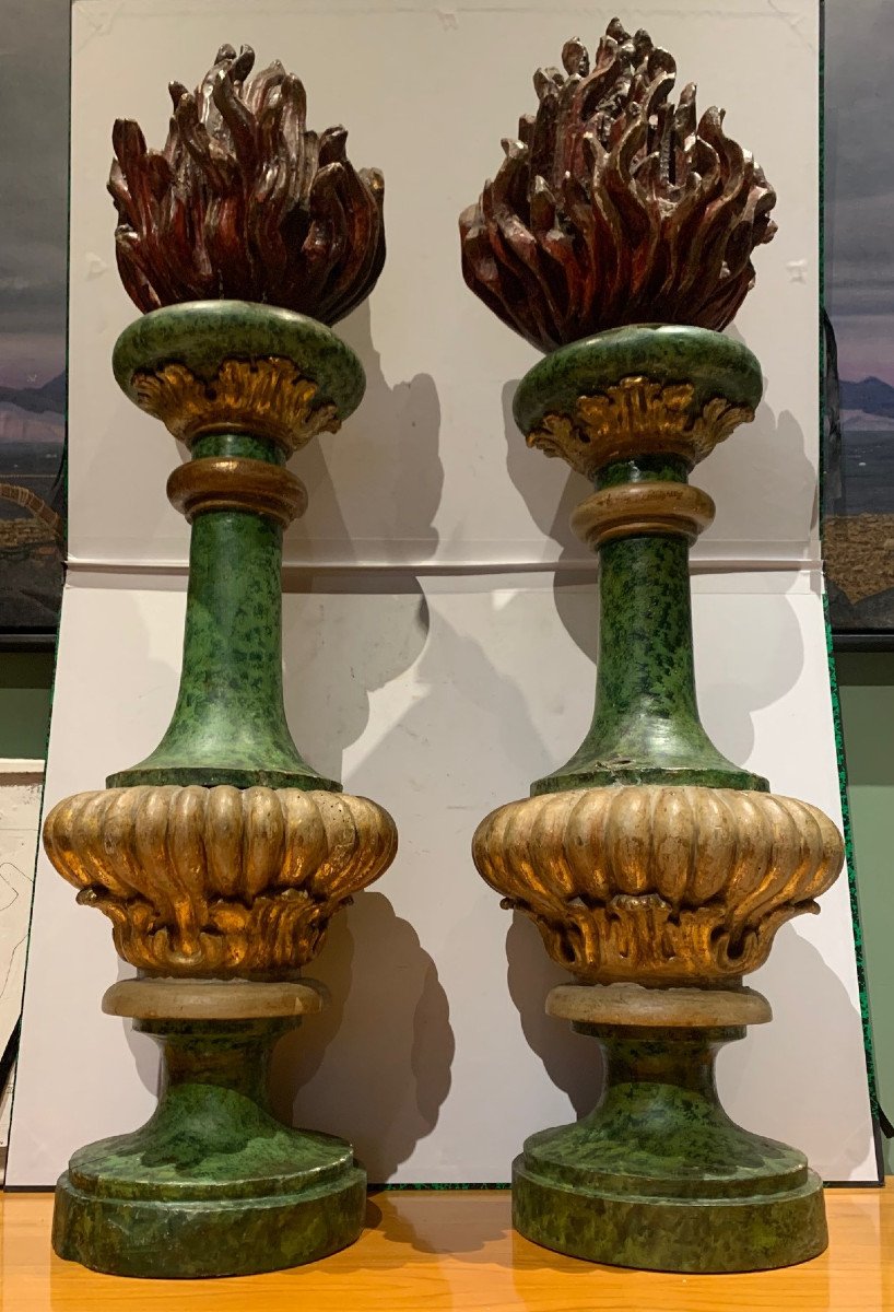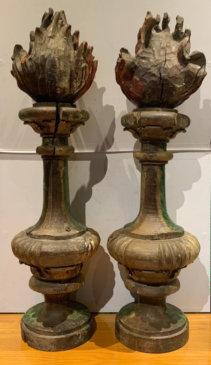 Paire de pots à feu XVIIème bois peint et doré
