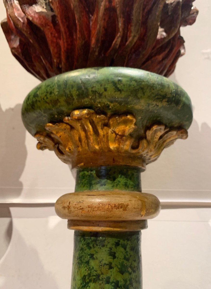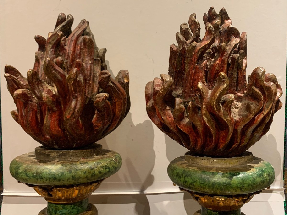 Surmontée de grosses flammes en bois peint.