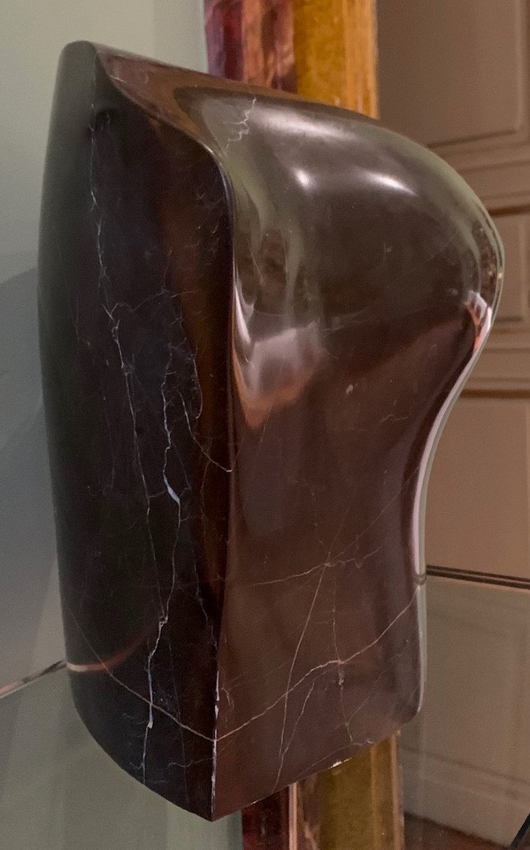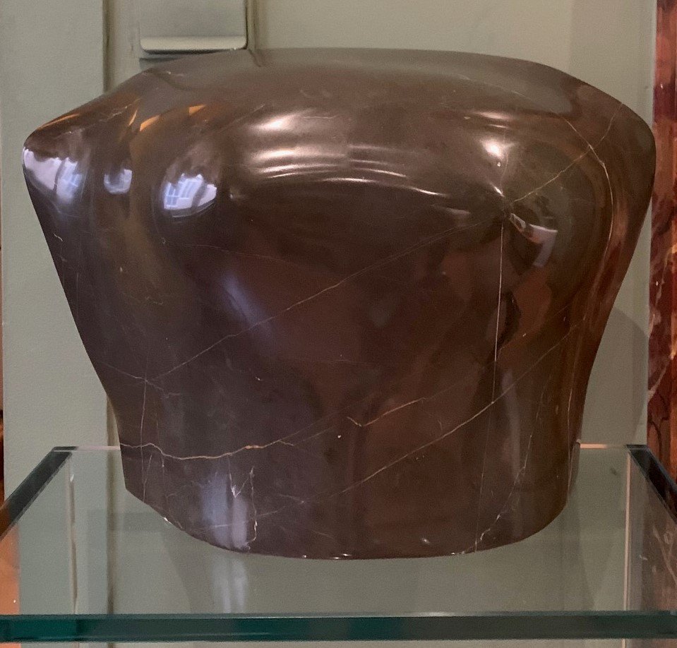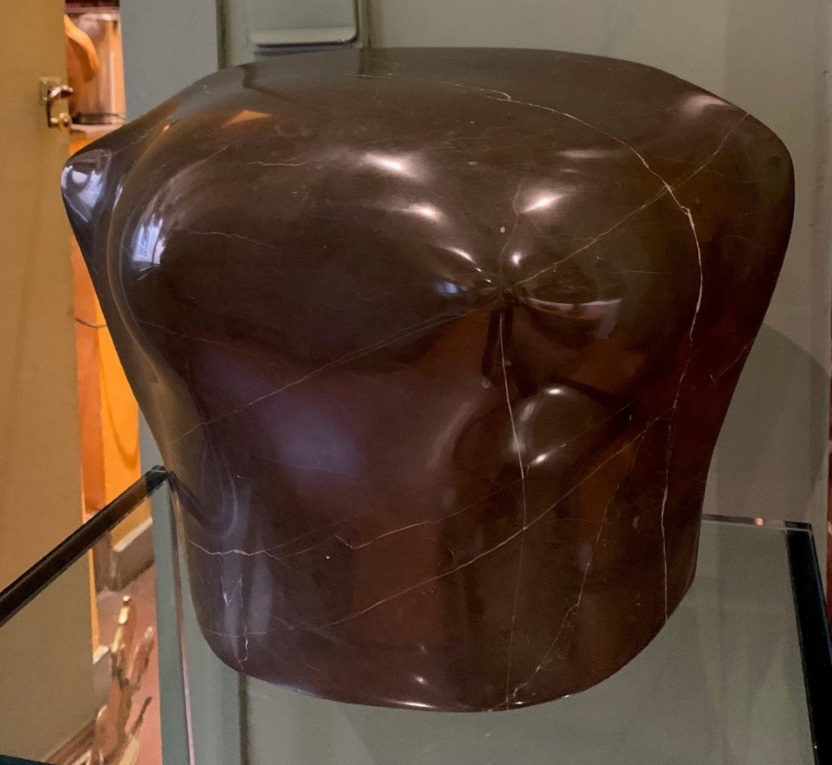 Sculpture moderne en marbre brun poli ( un torse de femme ? ) sur une selette en verre transparent .
