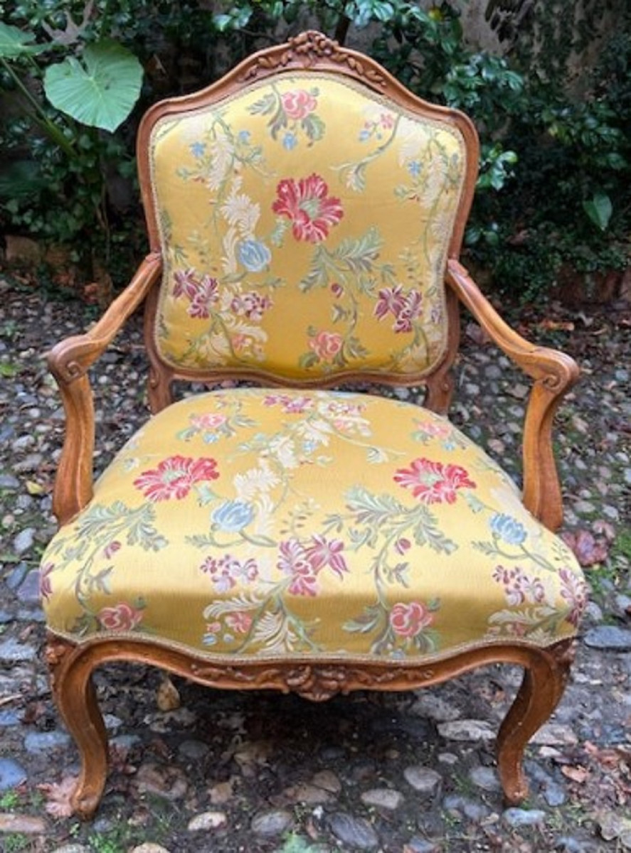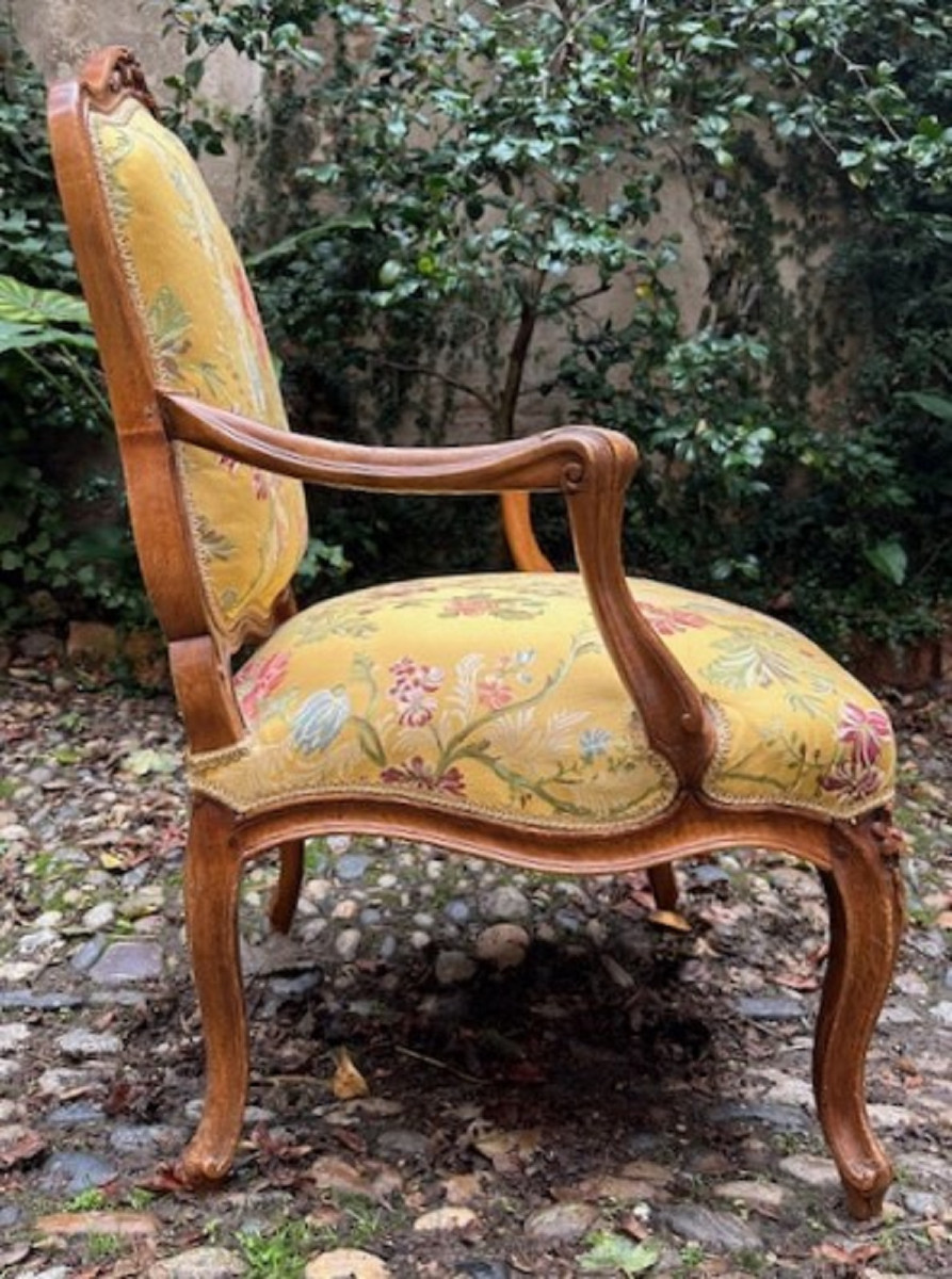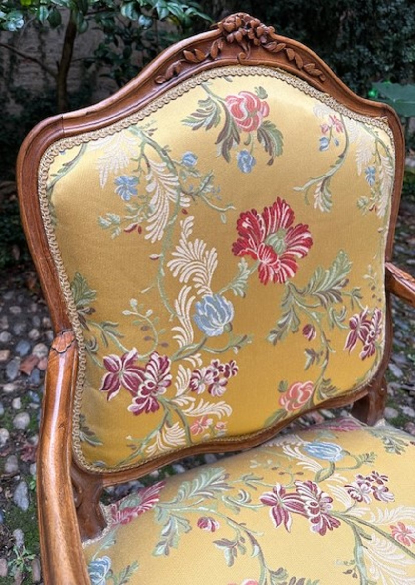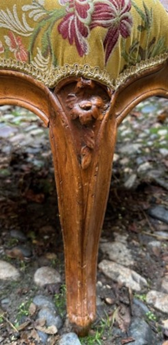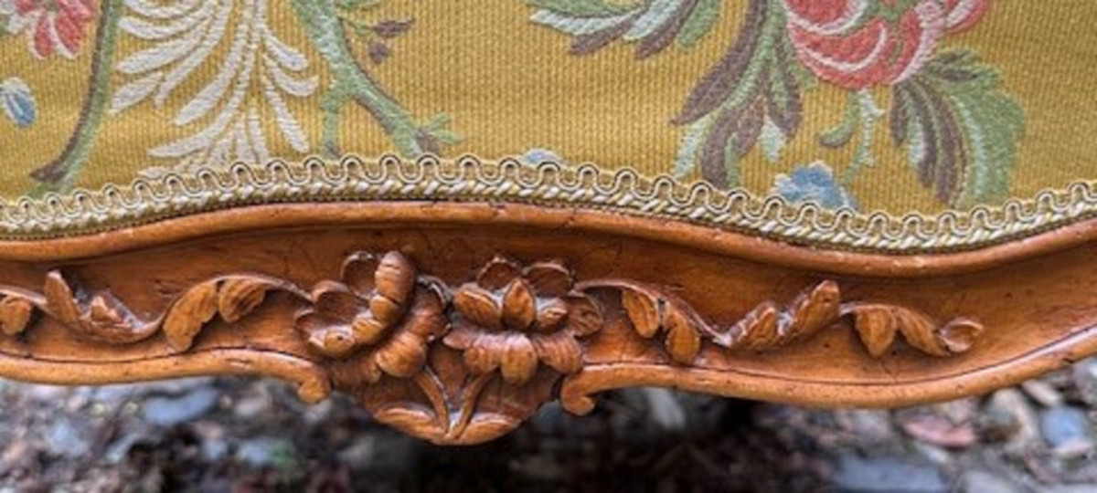 Sculptures sur la traverse haute du dossier et sur la ceinture de l’assise , centrées de fleurs et de feuillages.