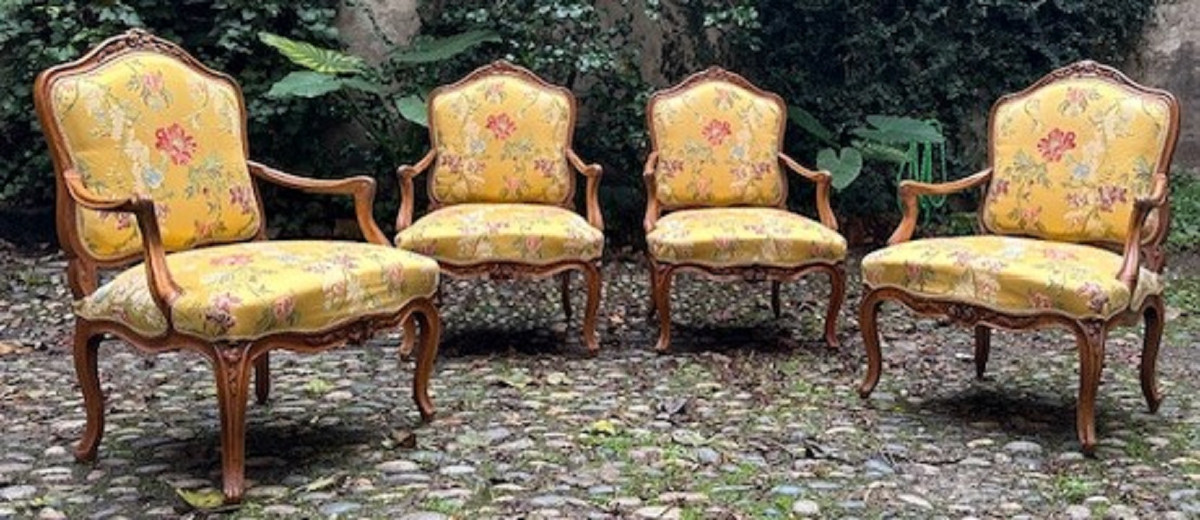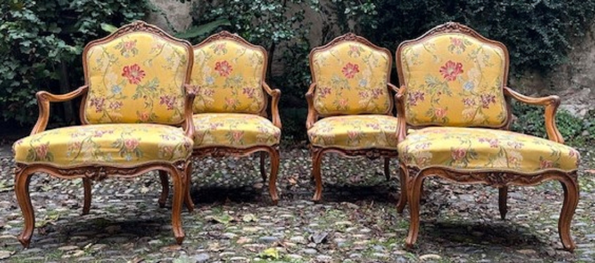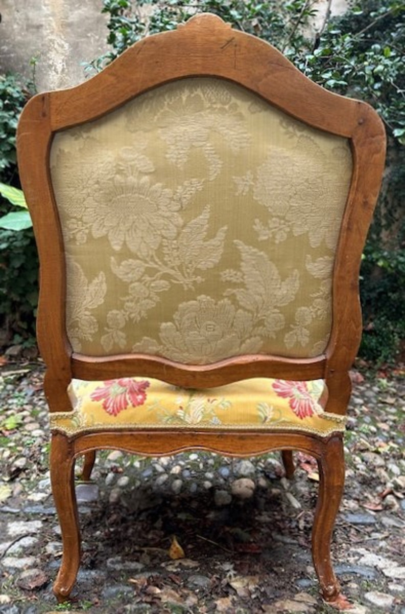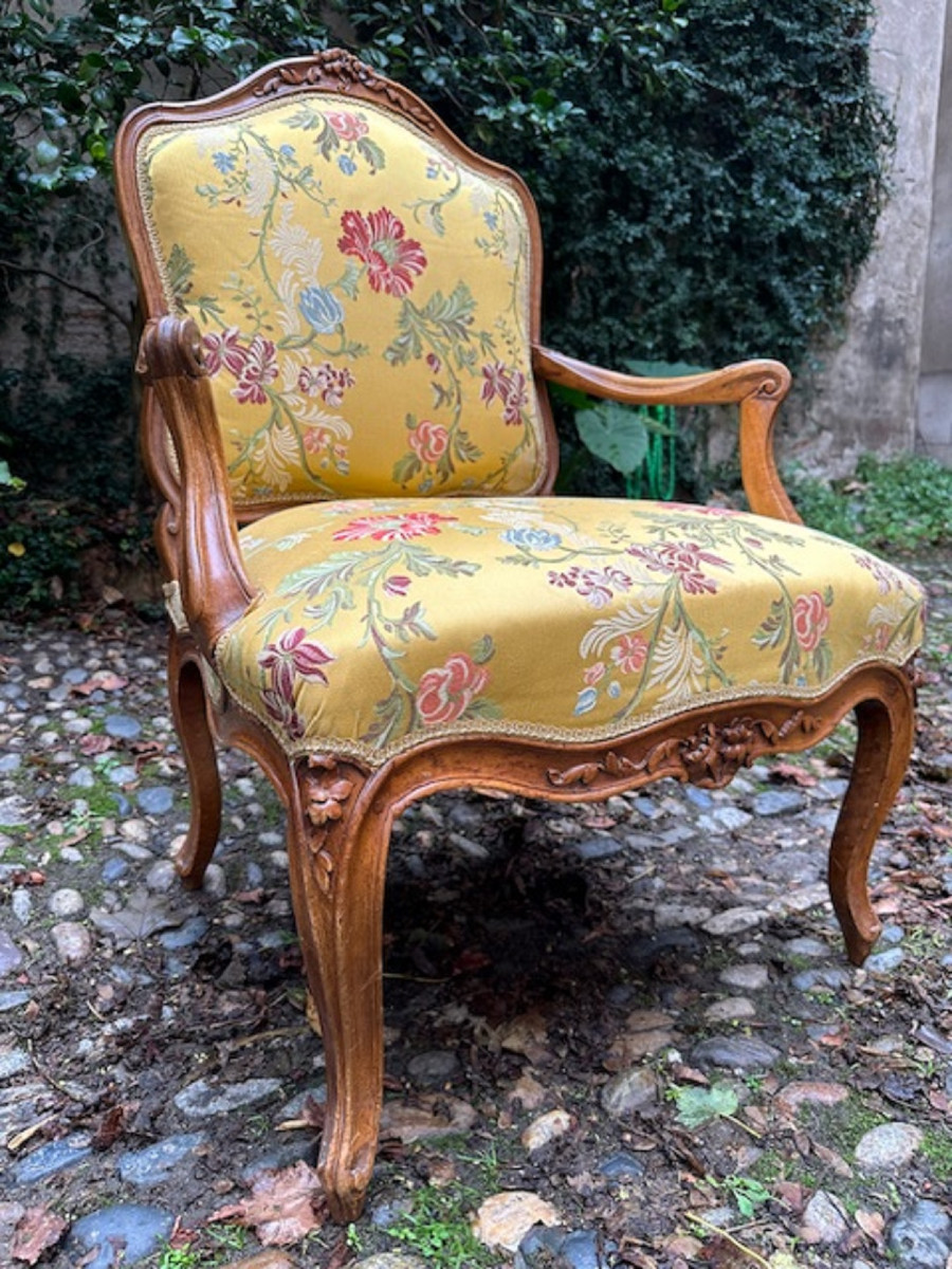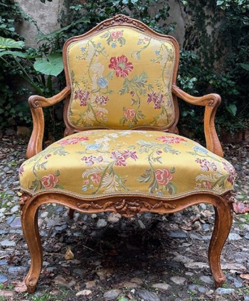 Sculptures sur la traverse haute du dossier et sur la ceinture de l’assise , centrées de fleurs et de feuillages.