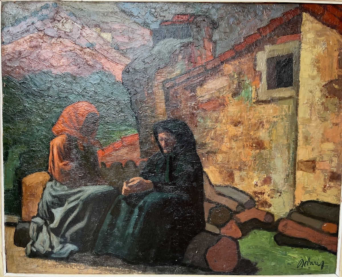 Deux catalanes assises près d’un mas catalan dans un paysage près de Collioure .