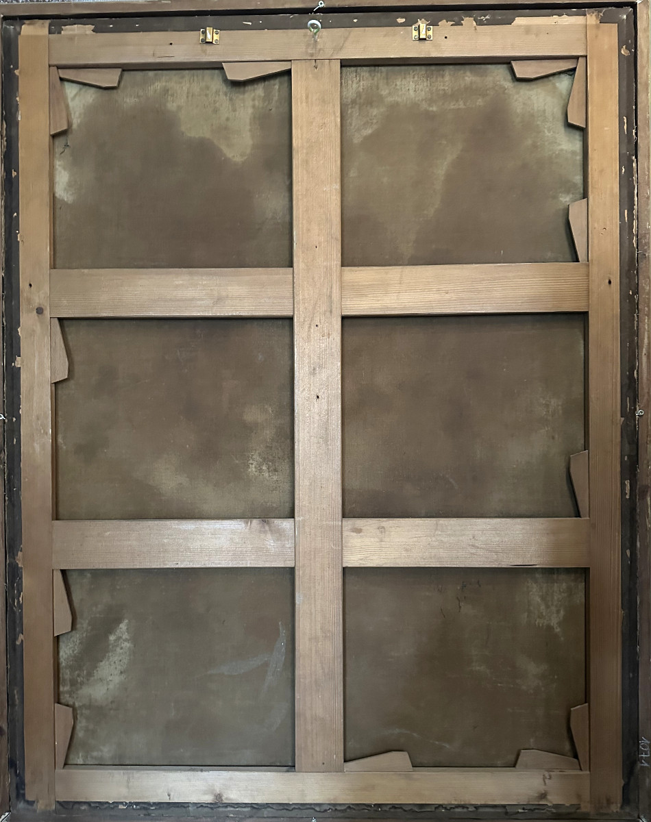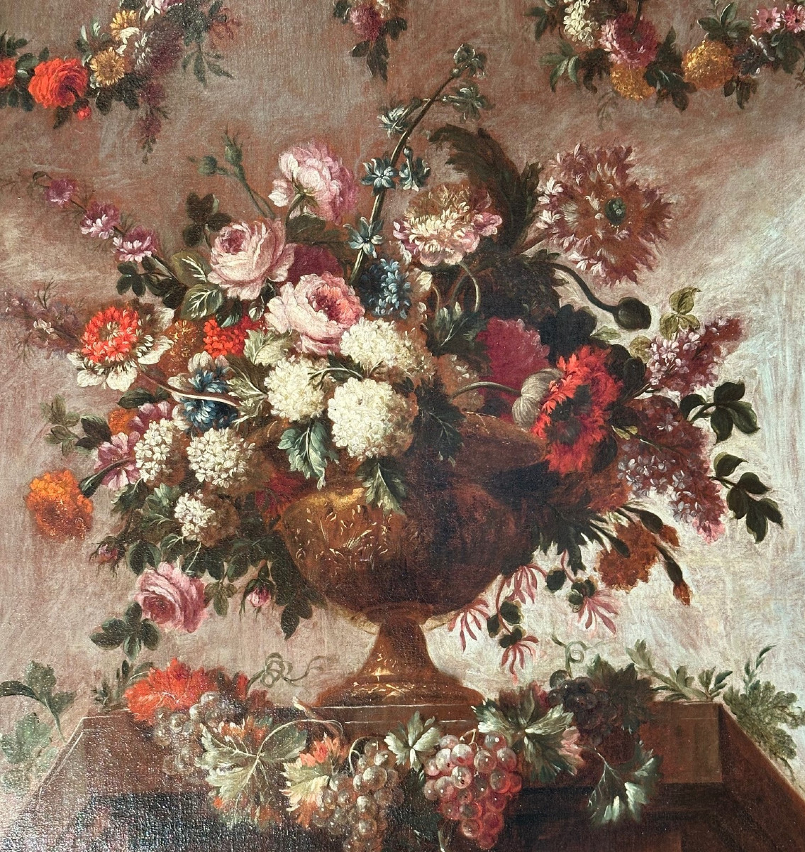 Grand tableau huile sur toile représentant une composition florale.